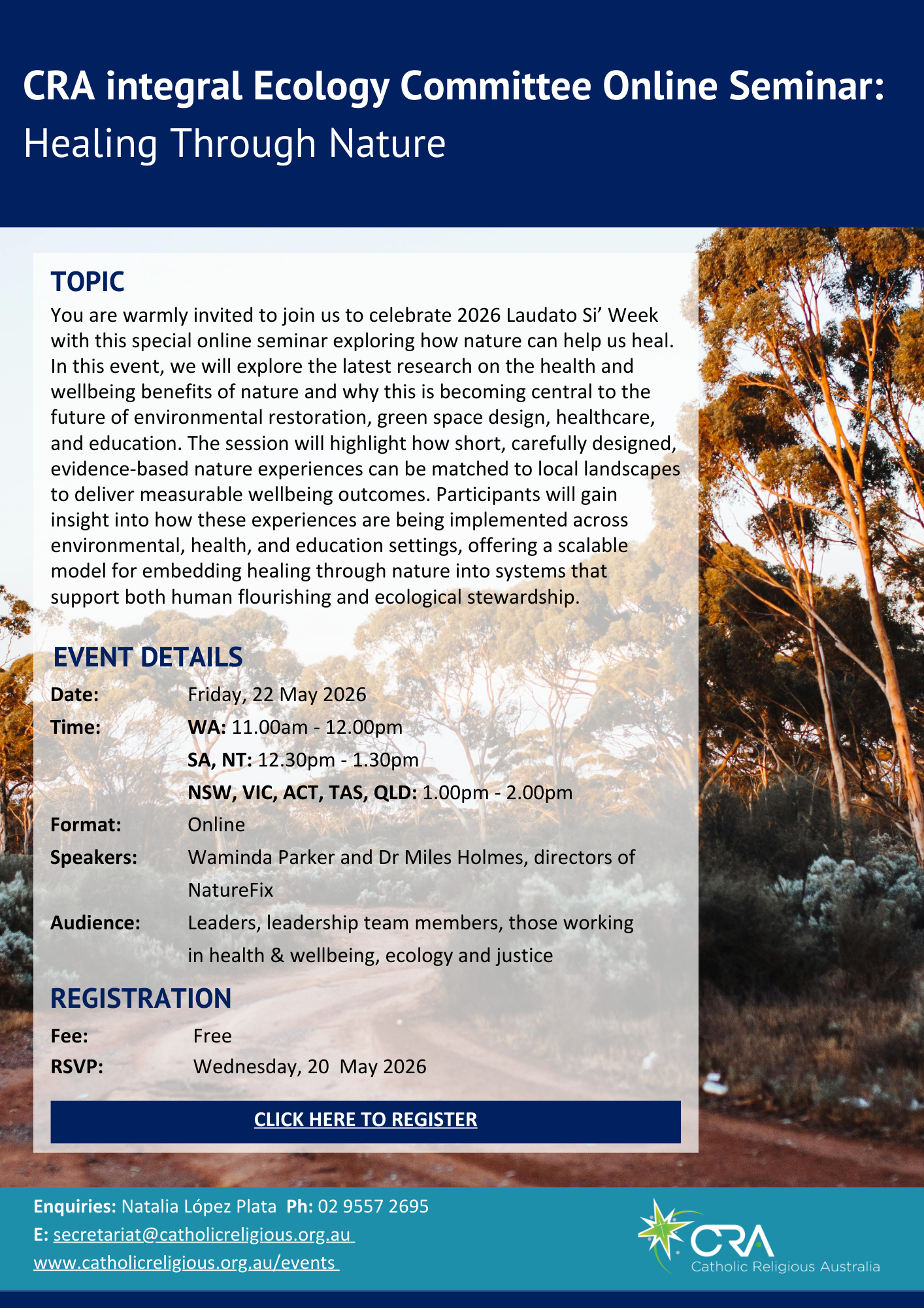 You are warmly invited to join us to celebrate 2026 Laudato Si’ Week with this special online seminar exploring how nature can help us heal. In this event, we will explore the latest research on the health and wellbeing benefits of nature and why this is becoming central to the future of environmental restoration, green space design, healthcare, and education. The session will highlight how short, carefully designed, evidence-based nature experiences can be matched to local landscapes to deliver measurable wellbeing outcomes. Participants will gain insight into how these experiences are being implemented across environmental, health, and education settings, offering a scalable model for embedding healing through nature into systems that support both human flourishing and ecological stewardship.