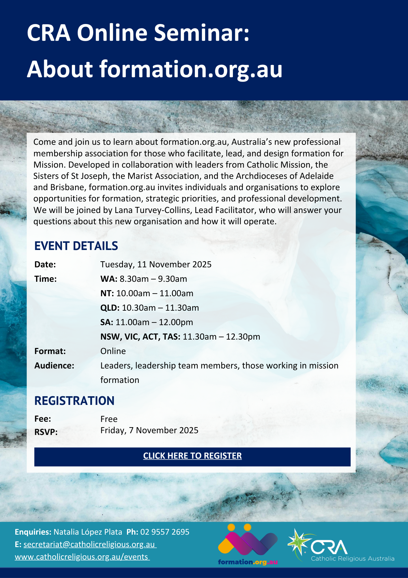 Come and join us to learn about formation.org.au, Australia’s new professional membership association for those who facilitate, lead, and design formation for Mission. Developed in collaboration with leaders from Catholic Mission, the Sisters of St Joseph, the Marist Association, and the Archdioceses of Adelaide and Brisbane, formation.org.au invites individuals and organisations to explore opportunities for formation, strategic priorities, and professional development. We will be joined by Lana Turvey-Collins, Lead Facilitator, who will answer your questions about this new organisation and how it will operate.