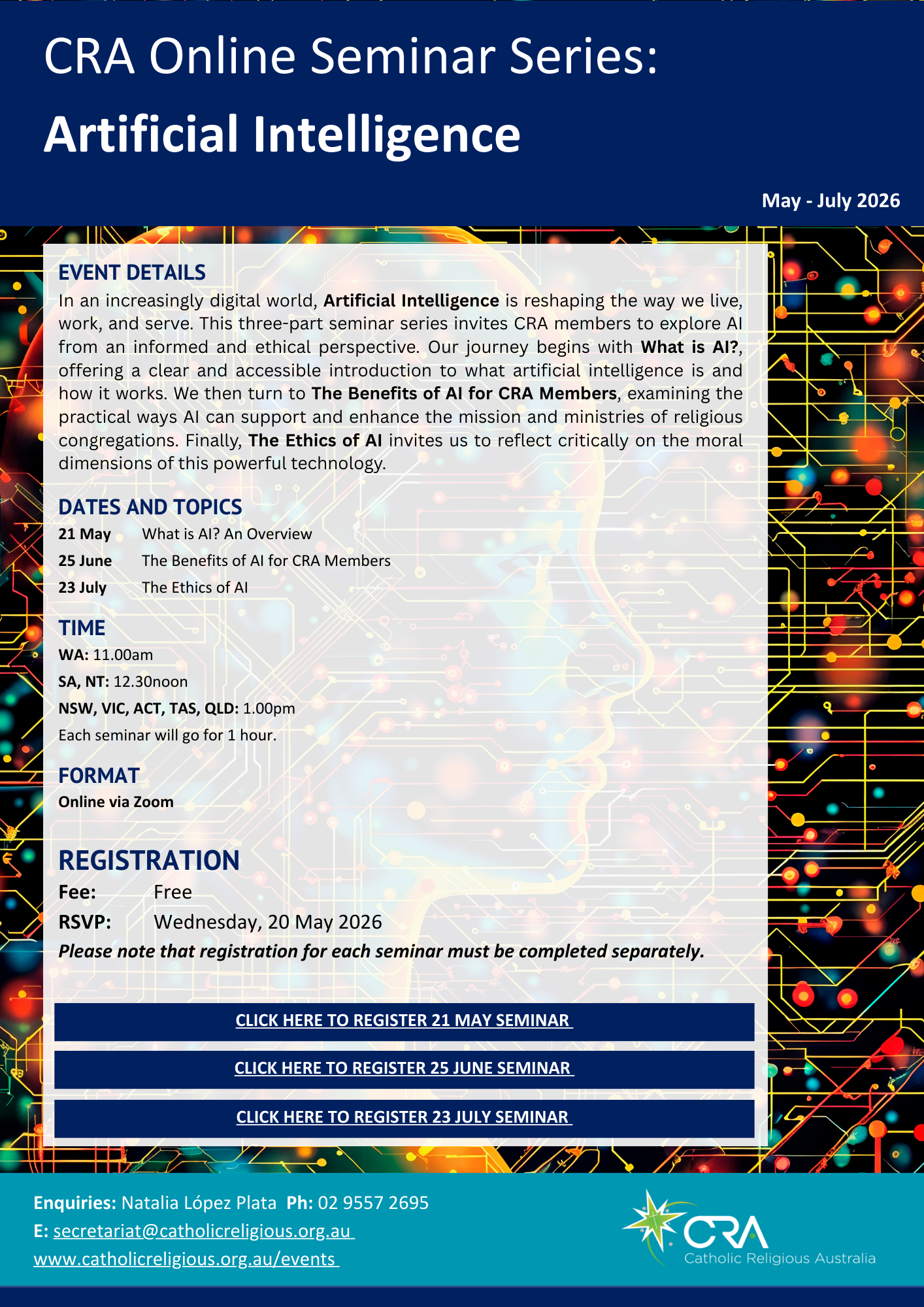 In an increasingly digital world, Artificial Intelligence is reshaping the way we live, work, and serve. This seminar is the first in a three-part series inviting CRA members to explore AI from an informed and ethical perspective.