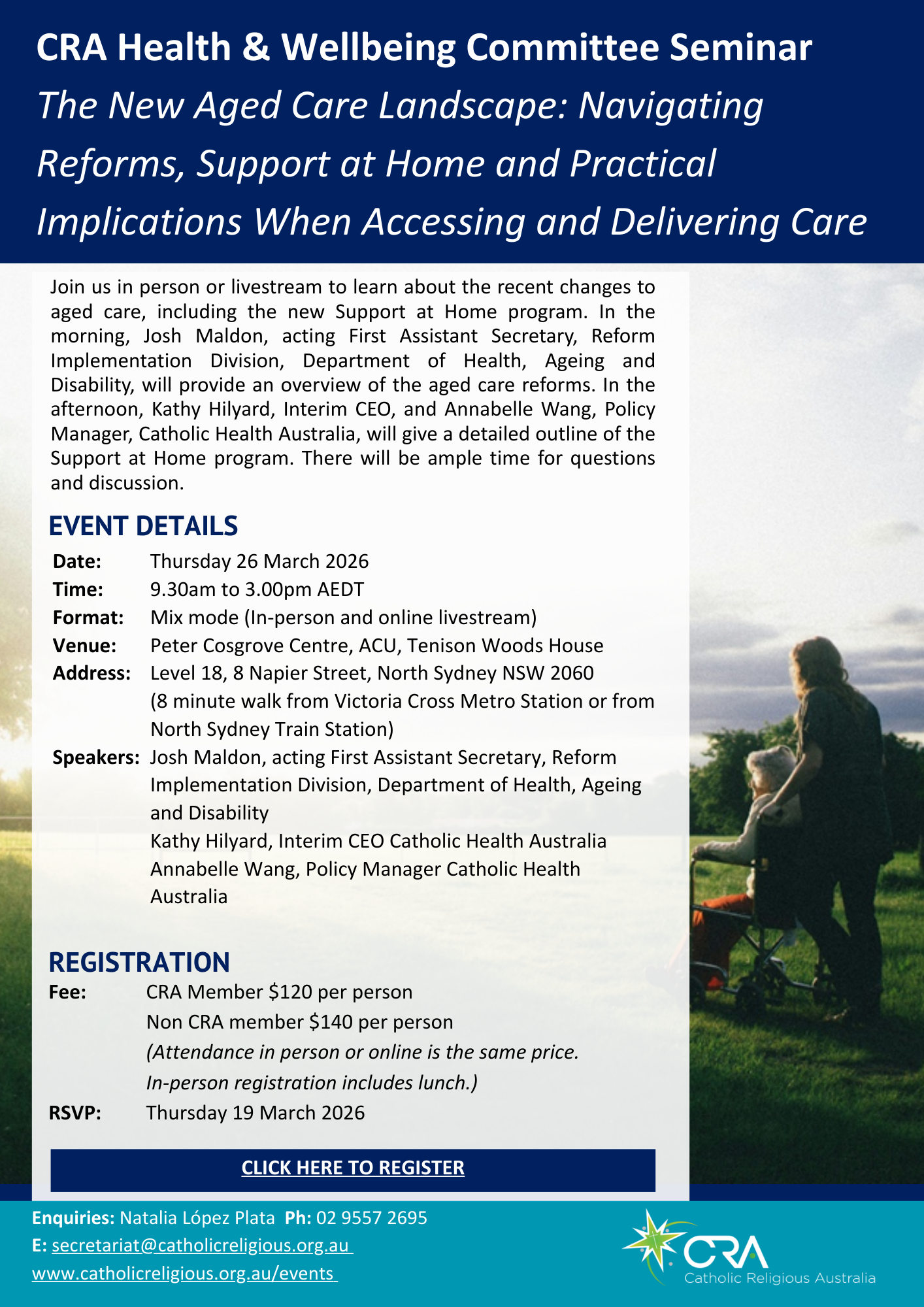 Join us in person or livestream to learn about the recent changes to aged care, including the new Support at Home program. In the morning, Josh Maldon, acting First Assistant Secretary, Reform Implementation Division, Department of Health, Ageing and Disability, will provide an overview of the aged care reforms. In the afternoon, Kathy Hilyard, Interim CEO, and Annabelle Wang, Policy Manager, Catholic Health Australia, will give a detailed outline of the Support at Home program. There will be ample time for questions and discussion.