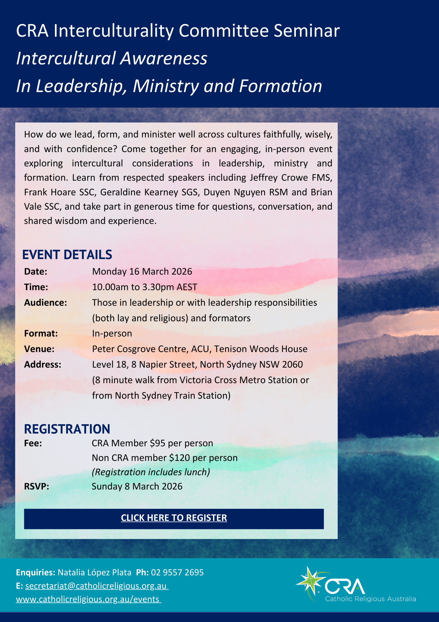 How do we lead, form, and minister well across cultures faithfully, wisely, and with confidence? Come together for an engaging, in-person event exploring intercultural considerations in leadership, ministry and formation. Learn from respected speakers including Jeffrey Crowe FMS, Frank Hoare SSC, Geraldine Kearney SGS, Duyen Nguyen RSM and Brian Vale SSC, and take part in generous time for questions, conversation, and shared wisdom and experience.